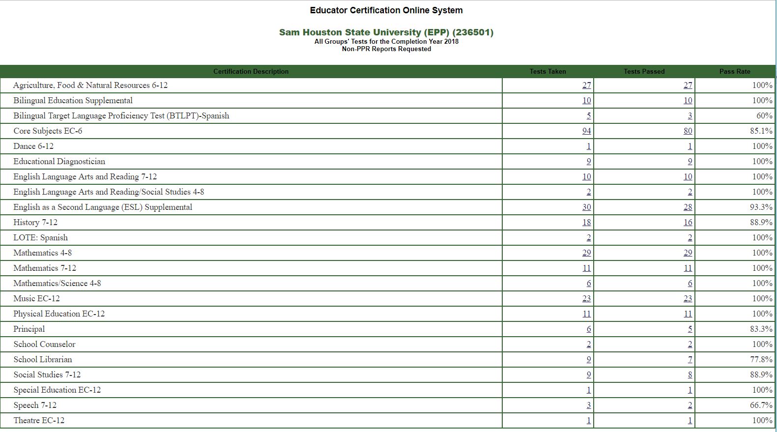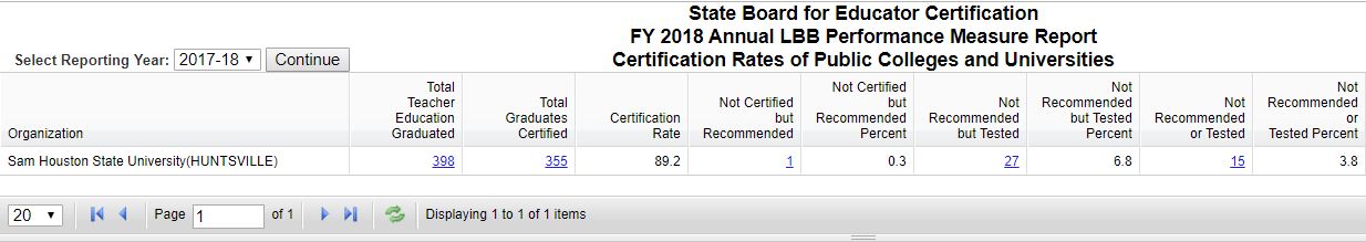 Candidates must pass Texas certification exams "TExES" in order to become certified as teachers or in advanced roles. The State provides official pass rates on an annual basis. In addition, teacher candidate pass rates are pushed to the US Department of Education Title II database. These pass rates are also available on an annual basis. Lastly, the State's Legislative Budget Board (LBB) provides a report on undergraduate teacher certification seekers, testers and applicants for certification.